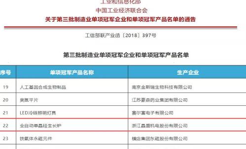 晶盛機電全自動單晶硅生長爐入選“第三批制造業(yè)單項冠軍產(chǎn)品”名單