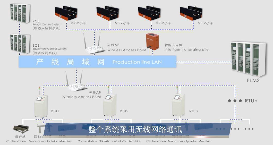 據(jù)了解,“光伏電池片生產(chǎn)車(chē)間物流自動(dòng)化項(xiàng)目”主要架構(gòu)包含智能AGV小車(chē)、六軸機(jī)器人、三軸機(jī)械手、RTU智能控制系統(tǒng)等,運(yùn)用先進(jìn)的物聯(lián)網(wǎng)技術(shù),讓各生產(chǎn)環(huán)節(jié)和物流系統(tǒng)之間的信息交互得以實(shí)現(xiàn),由此實(shí)現(xiàn)了“花籃”(裝載光伏電池片的載具)在各生產(chǎn)模塊間運(yùn)輸?shù)淖詣?dòng)化和智能化運(yùn)輸。